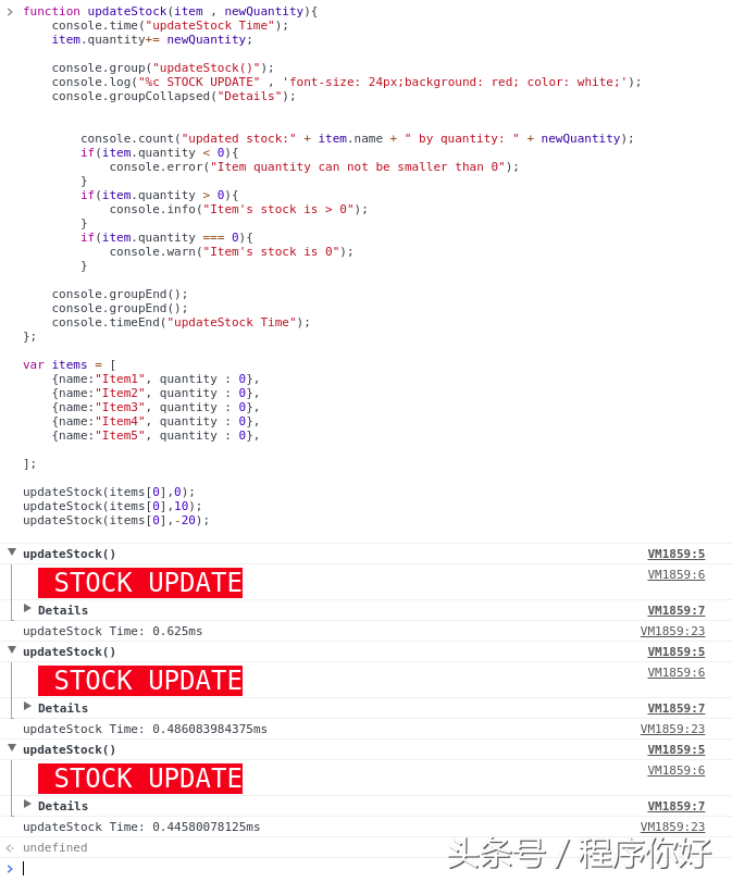 您可以使用console.time(label)和console.timeEnd(label)来度量代码执行所需的时间。让我们在我们的简单示例中计算updateStock()方法的执行时间: