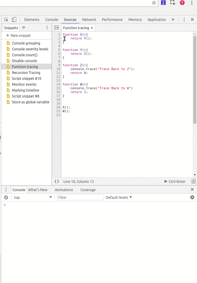 值得一提的是,console.trace()也可以与DevTools Snippets工具一起使用。