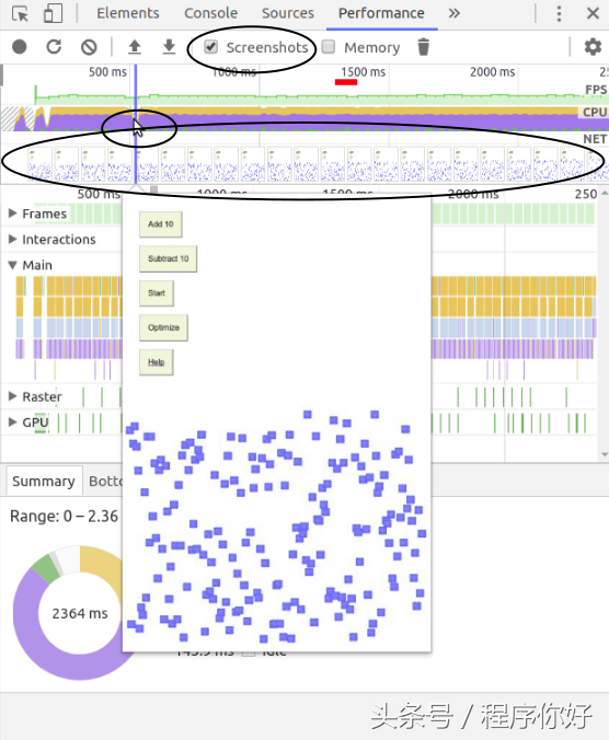 DevTools允许您放大性能选项卡报表的不同图表和区域。你可以专注于一段时间,这将帮助你清楚地了解在几毫秒的时间内发生了什么。