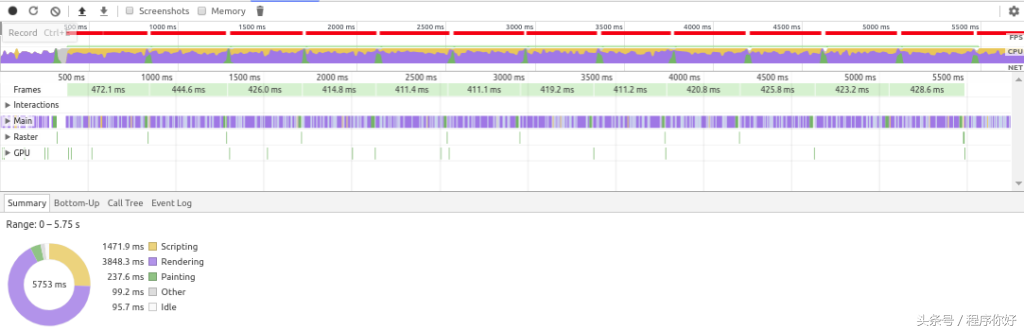 我们已经对该应用进行了5.75s(或5753ms)的描述。当没有选定的时间部分时——在overview区域,FPS和其他图表存在的地方——范围指向整个分析周期。它显示浏览器正在执行的活动的彩色细分。我们可以从这个细分中得出一些结论:在5753 ms中,3848.3ms(最长时间)用于渲染,95.7ms线程空闲。