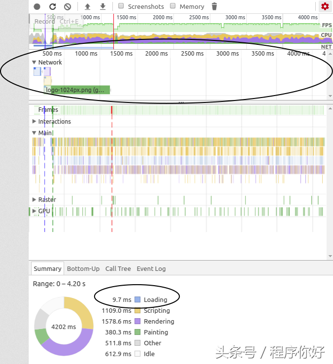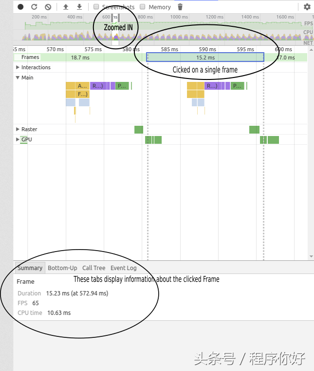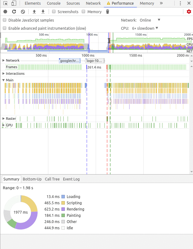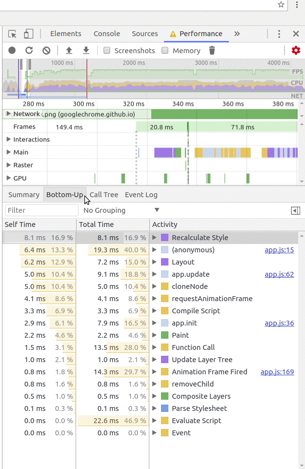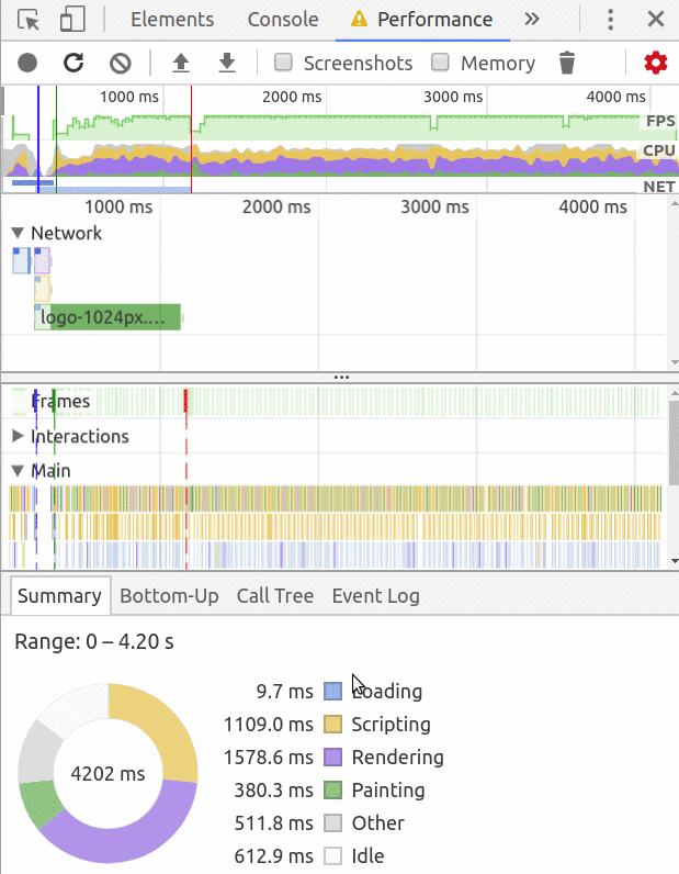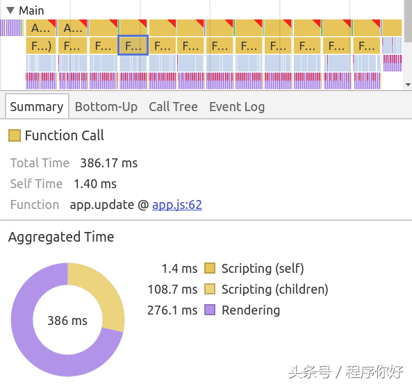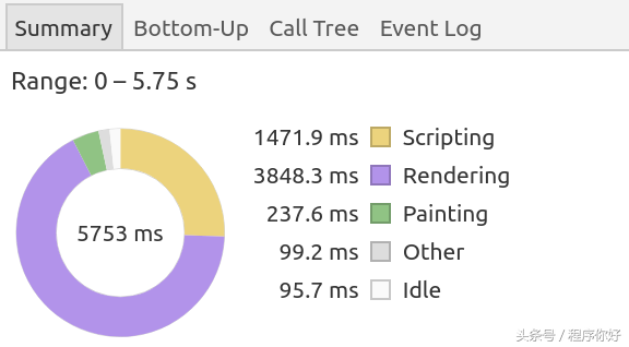 summary选项卡为您提供详细的计时信息——也就是浏览器所花费的时间。在您能够采取步骤优化代码之前,您需要获得关于您需要采取行动的确切位置的信息。为此,您可以在Performance选项卡下使用其他工具(调用Tree选项卡、自底向上选项卡和事件日志表格视图)。