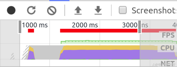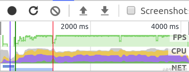 Flame Graphs显示了代码的JavaScript堆栈的状态(包含调用函数和事件的详细信息),在性能分析过程的时间范围内是毫秒级。