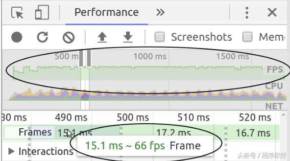 框架部分,位于图表区域的正下方,包含代表框架的绿色框。当您将鼠标移动到特定的帧上时,DevTools向您展示了两个重要的细节:FPS速率,以及所有操作所花费的时间。