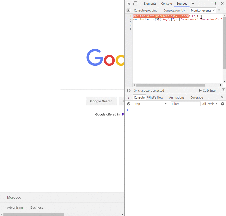 您可以使用monitorEvents方法从控制台监视DOM事件,该方法将要监视的对象作为第一个参数,并将侦听的事件数组作为第二个参数。例如,让我们监视谷歌网站scroll,mousedown,mouseup mouseover事件: