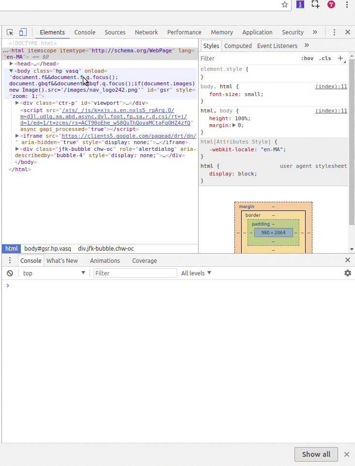 DevTools控制台有一个方法,允许您使用CSS选择器查询当前的HTML文档。该方法可以通过输入$(selector)来使用,并为所有选择器返回一个数组。