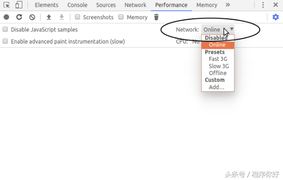 您可以选择不同的网络条件,如联机、脱机、快速3G和慢3G。
