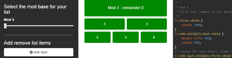 如果你读过 Patrick Clancey最近一篇文章上有关“取模查询”的内容,你对此会有更好地理解。这是一个工具/指南,可以帮助你理解这些 CSS 选择器,同时指导你使用他们在网格布局中放置的项目。