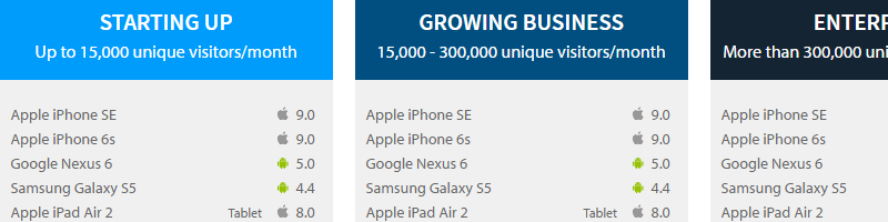 BrowserStack 上针对移动设备测试的指南,是基于市场份额数据、操作系统版本、屏幕大小、视口和分辨率等进行分类的。网站声明说:“我们从超过30,000个 BrowserStack 客户的使用统计数据和当前全球市场趋势中获得了数据。此列表将不断更新,以包括最新和即将推出的设备。”