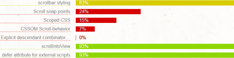 “这个页面是由来自于 caniuse.com 和 StatCounter 的数据驱动,显示了那些拥有原生支持各种 WEB 平台功能特性的浏览器的百分比。这个显然没有将polyfill 能力以及其它的向后兼容场景考虑在内。”