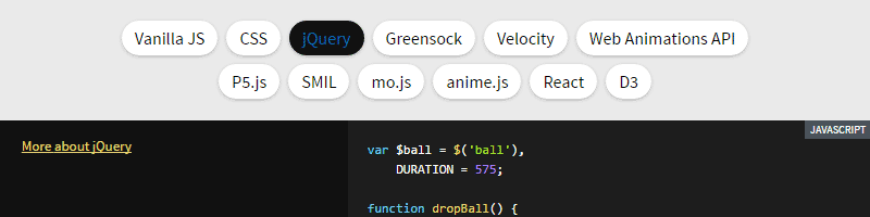 Sparkbox 的团队做了一个简单的互动页面,用于演示如何使用各种技术创建一个弹跳球动画。如果你考虑使用动画库,这是一个比较 API 和编码的不同的好方法。