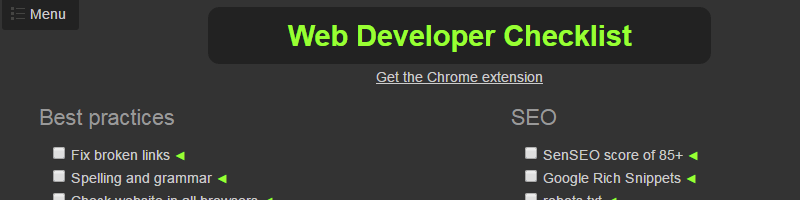 这是一份漂亮且内容丰富的检查表,可以帮助开发者完成项目。它包含了可用性、可访问性、SEO(搜索引擎优化)、代码质量、安全性以及许多其它的类目。而且类目里的每一项都带有超链接,能辅助你进行检查。