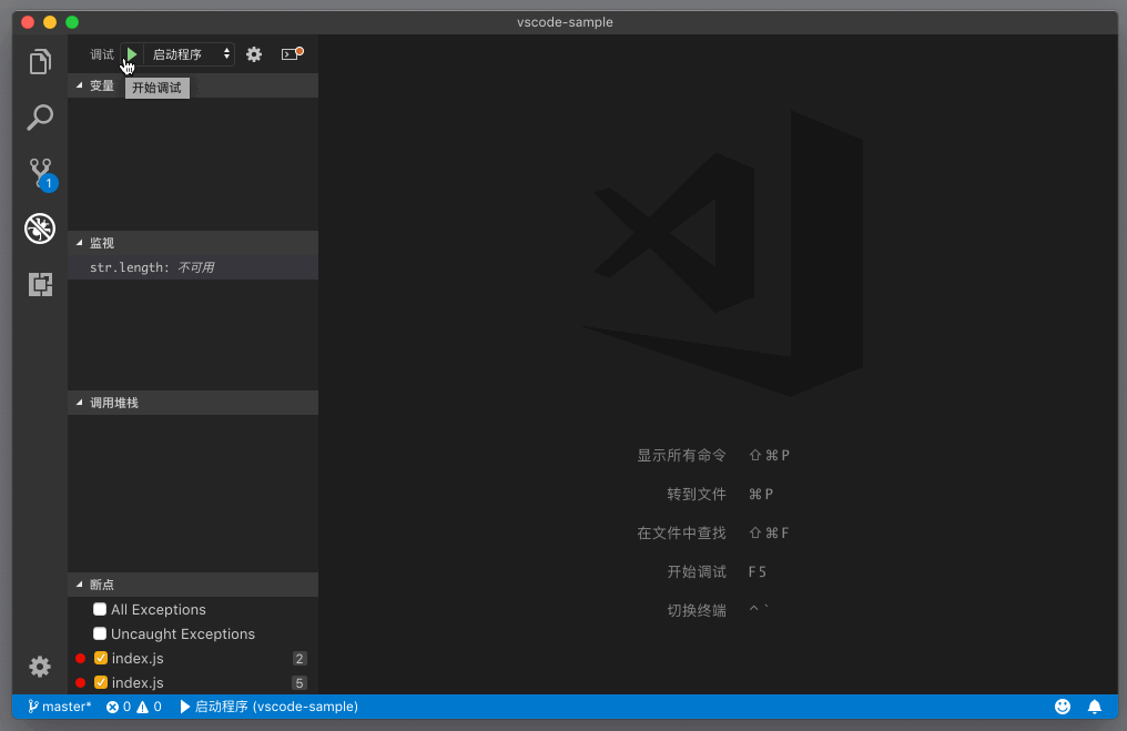 到这一步,即使我们关闭掉编辑器里全部的文件,当我们按下 F5 ,也能够将 Node.js 代码调试起来了。