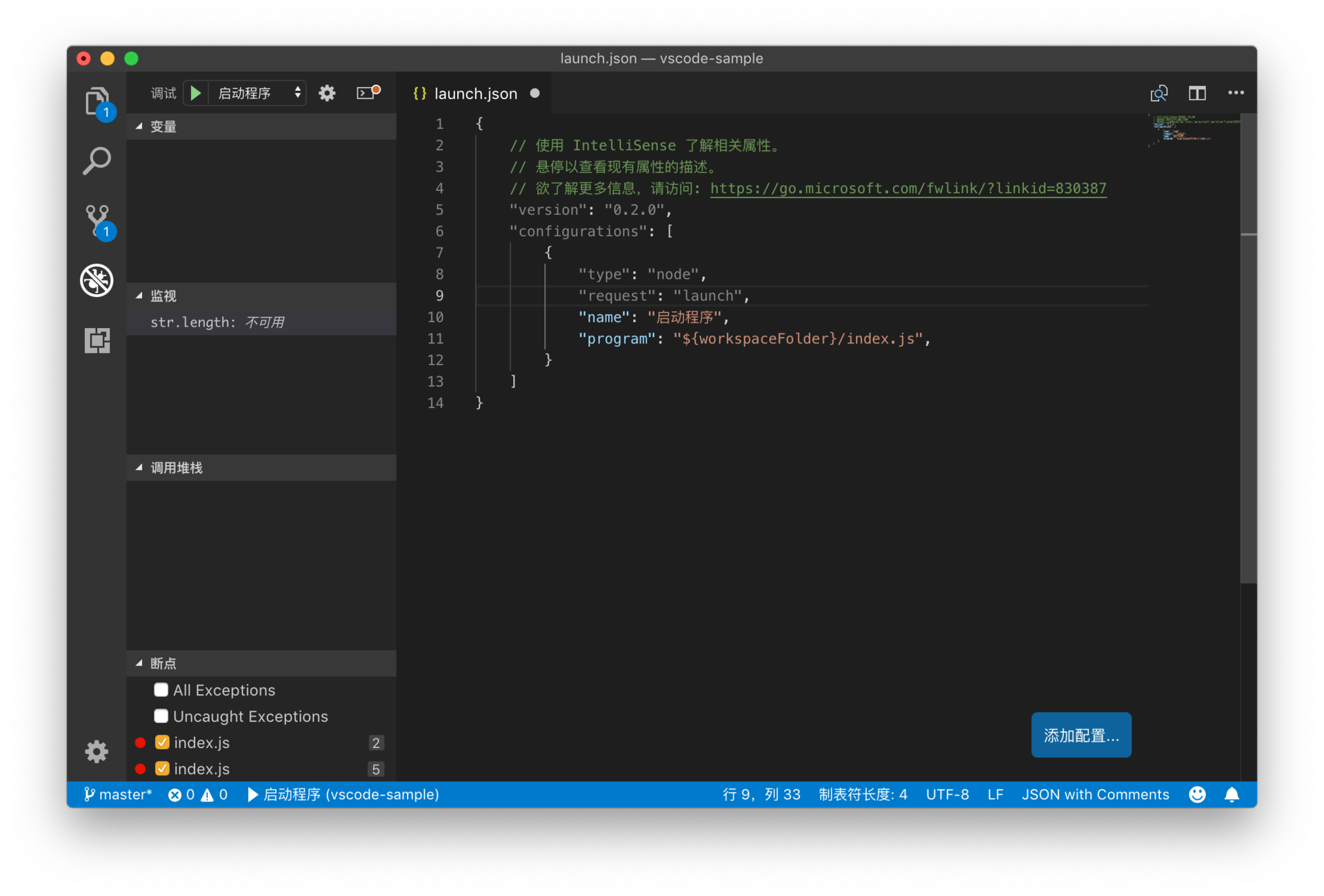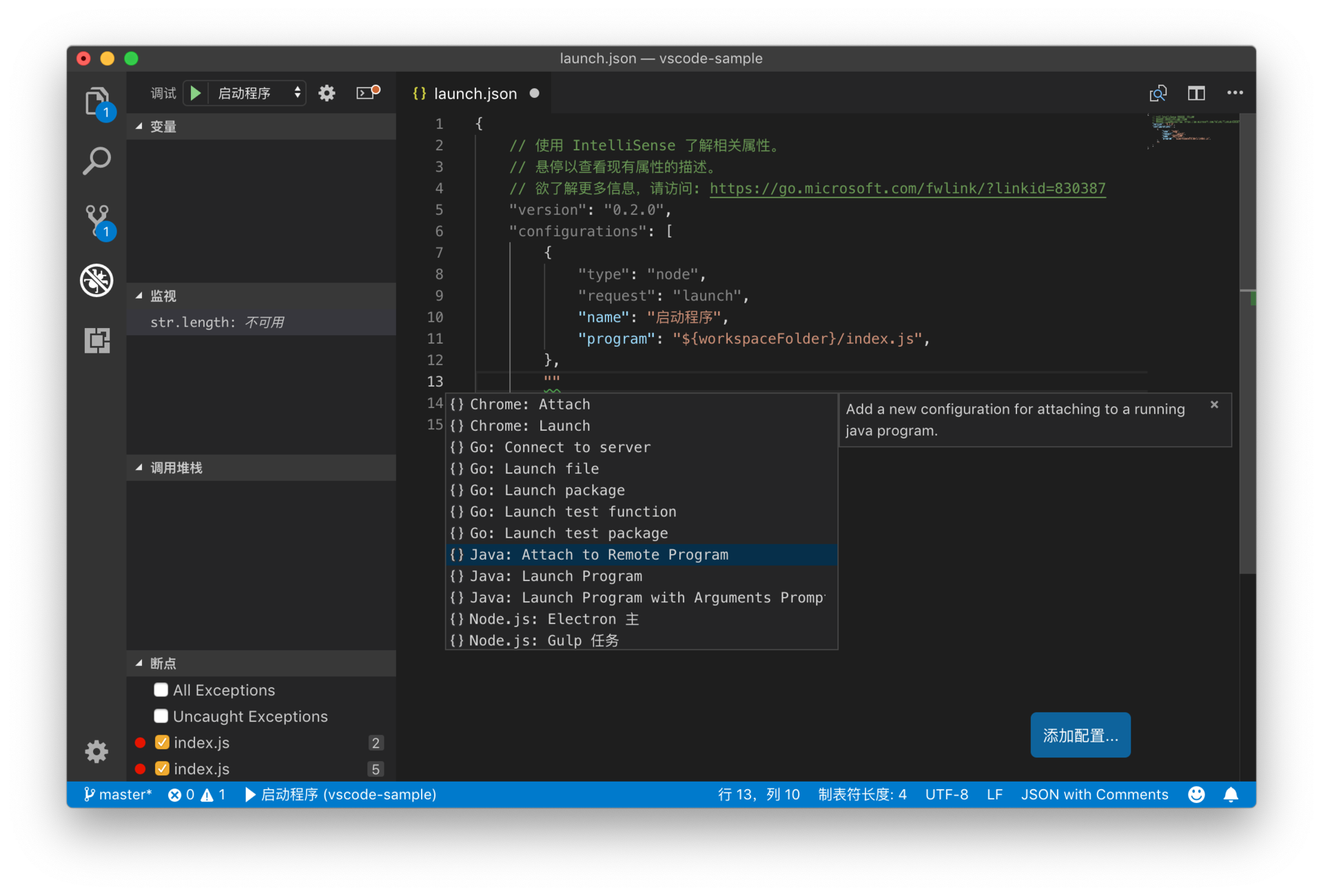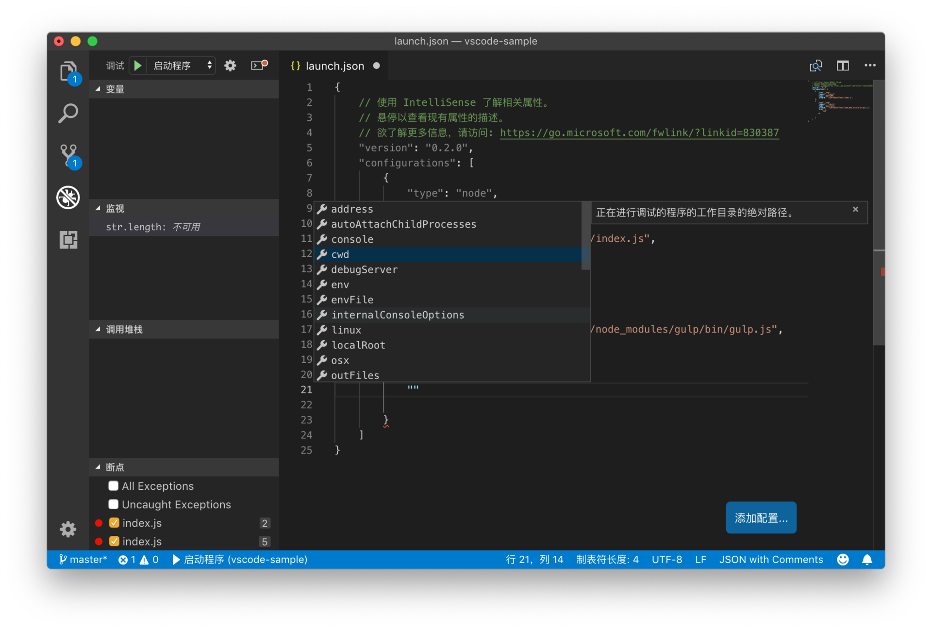 下面我们把 program 的值改为 ${workspaceFolder}/index.js,其中${workspaceFolder} 是代表当前工作区文件夹地址的预定义参数,使用它就能够准确地定位当前工作区里 index.js 文件了。(关于在配置文件里可以使用的预定义参数,请参考Visual Studio Code Variables Reference。 )