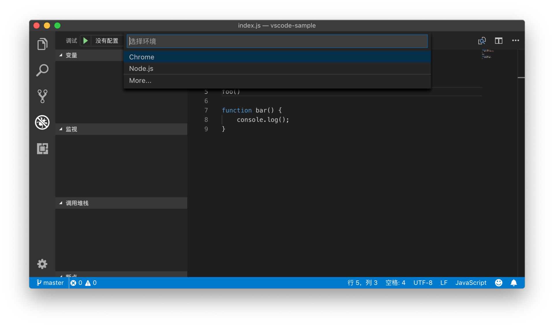 选择完 Node.js 后,我们可以看到 VS Code 的 UI 发生了变化,但是一闪而过,然后又恢复了正常。这是因为 VS Code 的 Node.js 调试器发现本地有 index.js 文件,于是直接执行了这个文件;index.js 文件内容非常简单,很快结束了。