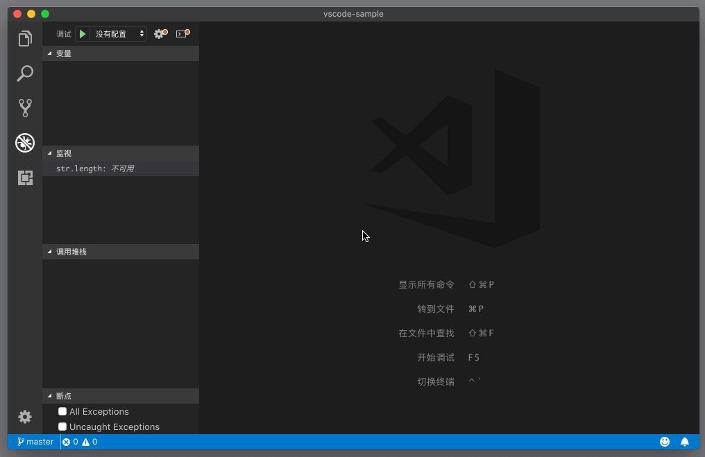 VS Code 中有一个专门的用于管理调试功能的视图。我们可以点击界面左侧“昆虫”(也就是 bug 啦)形状的按钮,或者按下 “Cmd + Shift + D” (Windows 上是 Ctrl + Shift + D)来唤出调试视图。