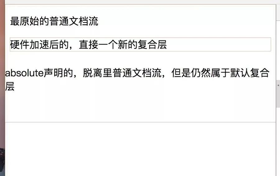 其次,absolute布局(fixed也一样),虽然可以脱离普通文档流,但它仍然属于默认复合层。